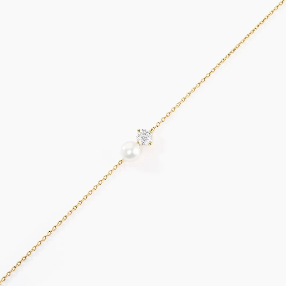 Bracelet Or Jaune 375/1000 Perle De Culture Blanche Bouton 4mm Et Oxyde De Zirconium Maille Forçat 16+2cm