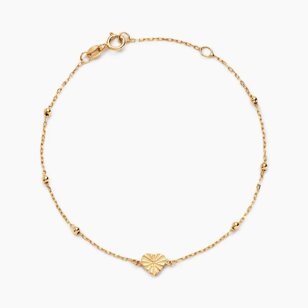 Bracelet Or Jaune 375/1000 C艙ur Strie Boules Maille Jaseron 16+2cm