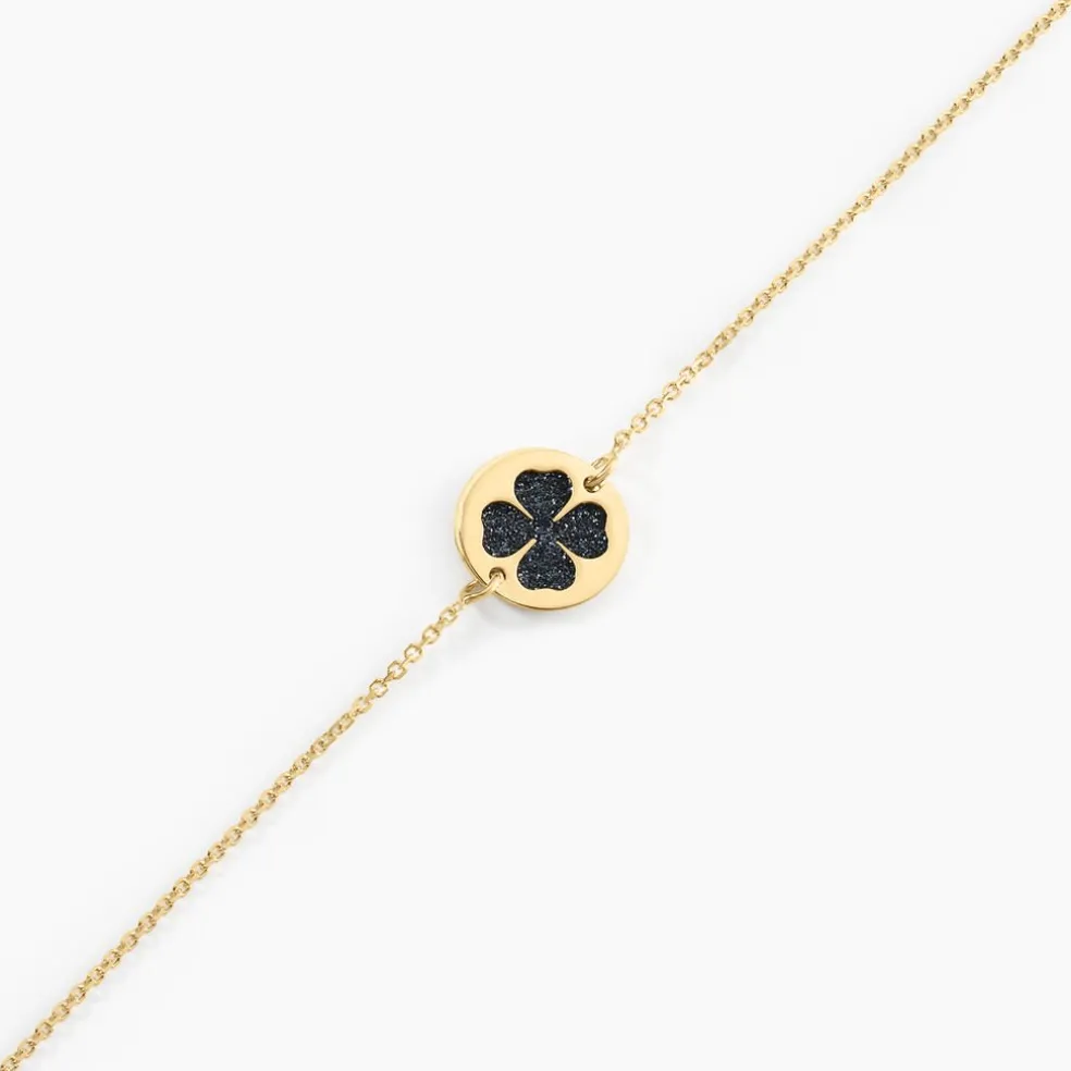 Bracelet Or Jaune 375/1000 Pastille Glitter Noir + Pastille Ajouree Motif Trefle Maille Jaseron 16+2cm