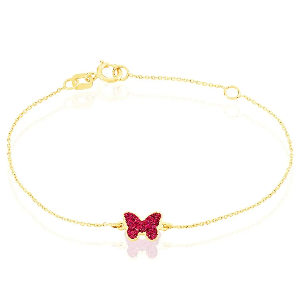 Bracelet Or Jaune 375/1000 Papillon Glitter Fushia Maille Jaseron 14cm