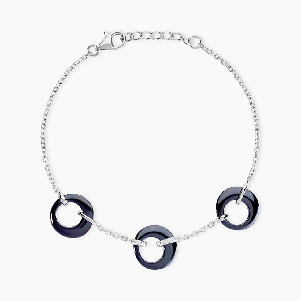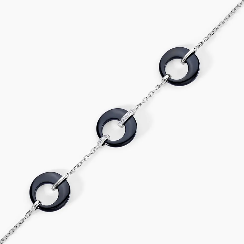 Bracelet Argent Blanc 925/1000 Ceramique Noire Formes Rondes Ajourees Et Oxydes De Zirconium 19cm