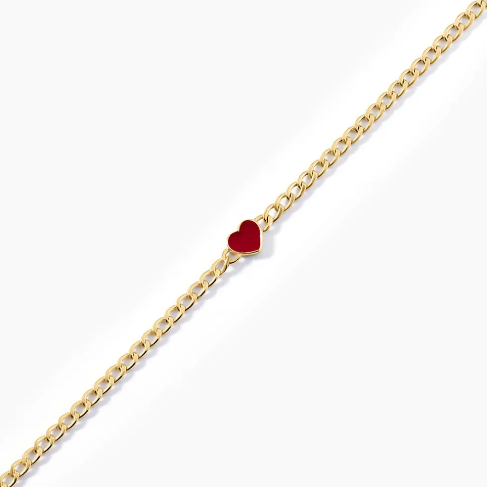 Bracelet Or Jaune 375/1000 C艙ur Email Rouge Maille Gourmette 18cm