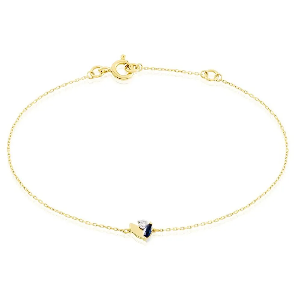 Bracelet Or Bicolore Jaune Et Blanc 375/1000 Fleur Saphir Navette 0.106cts Serti Griffes Et Diamants 0.01cts Serti Illusion Maille Forçat Ronde 16+2cm