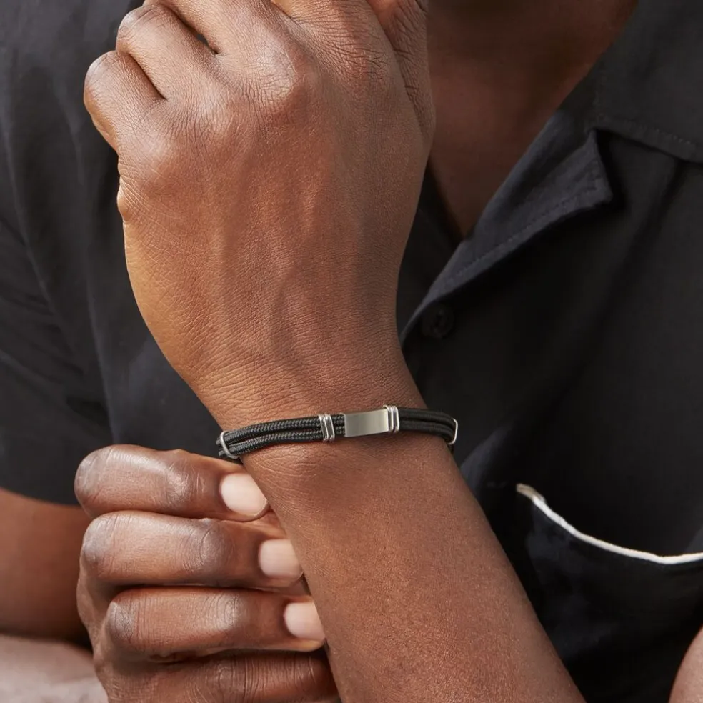 Bracelet Acier Inoxydable Blanc Plaque Acier Inoxydable Blanc Cordons Noirs Coton 21cm