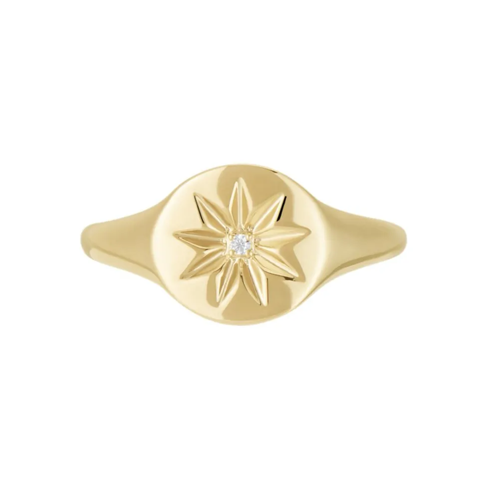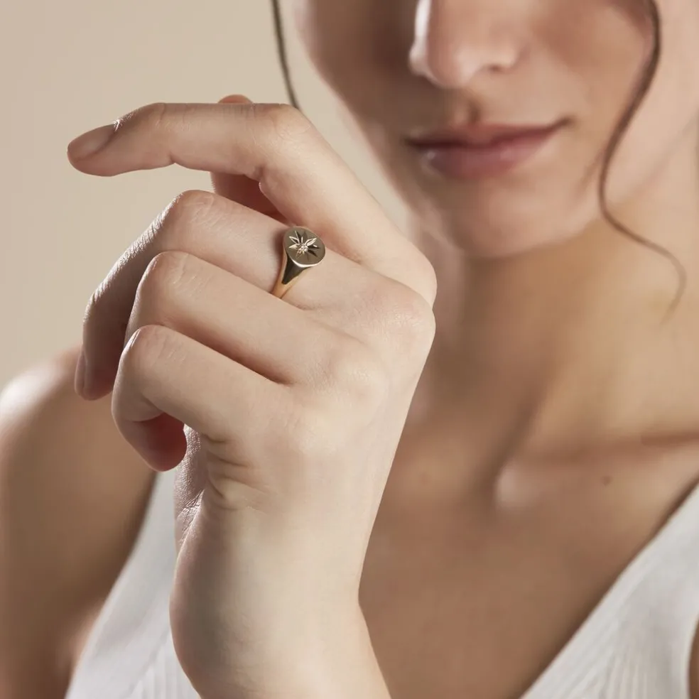 Chevaliere Plaque Or Jaune Plateau Rond Motif Etoile Oxyde De Zirconium
