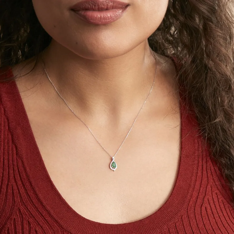 Collier Or Blanc 375/1000 Poire Emeraude Et Diamants 42cm