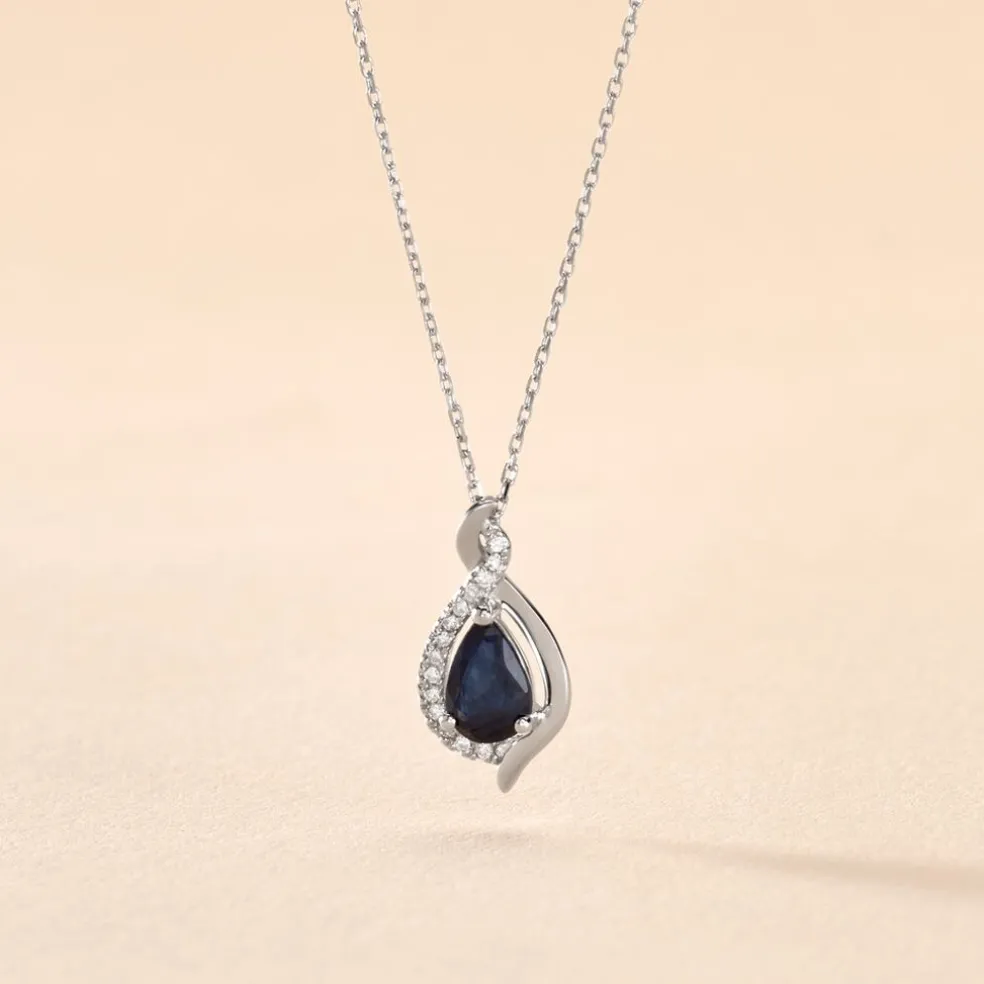 Collier Or Blanc 375/1000 Poire Saphir Et Diamants 42cm