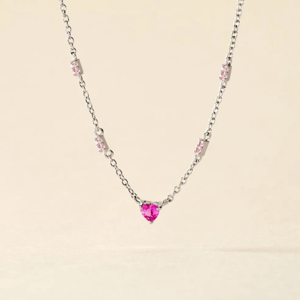 Collier Argent Blanc 925/1000 Coeur Oxydes De Zirconium Roses Maille Forcat 38+2cm
