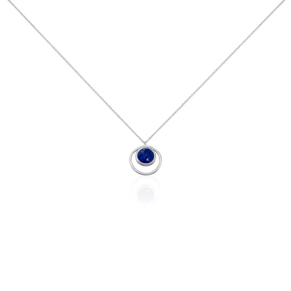 Collier Argent Blanc 925/1000 Double Cercles Lapis Lazuli Maille Forcat 45cm
