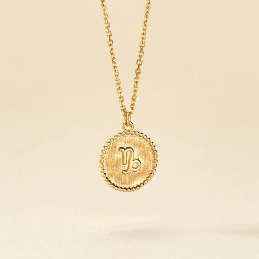 Collier Or Jaune 375/1000 Pastille Zodiaque Capricorne Brosse Effet Perlee Maille Jaseron 40+2cm