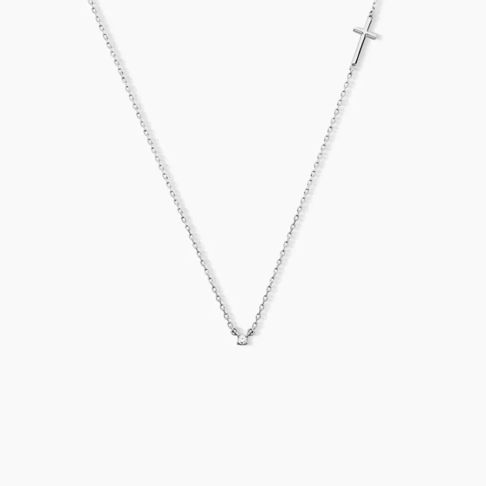 Collier Argent Blanc 925/1000 Croix Et Pampille Oxyde De Zirconium Serti 4 Griffes Maille Forçat 42+3cm