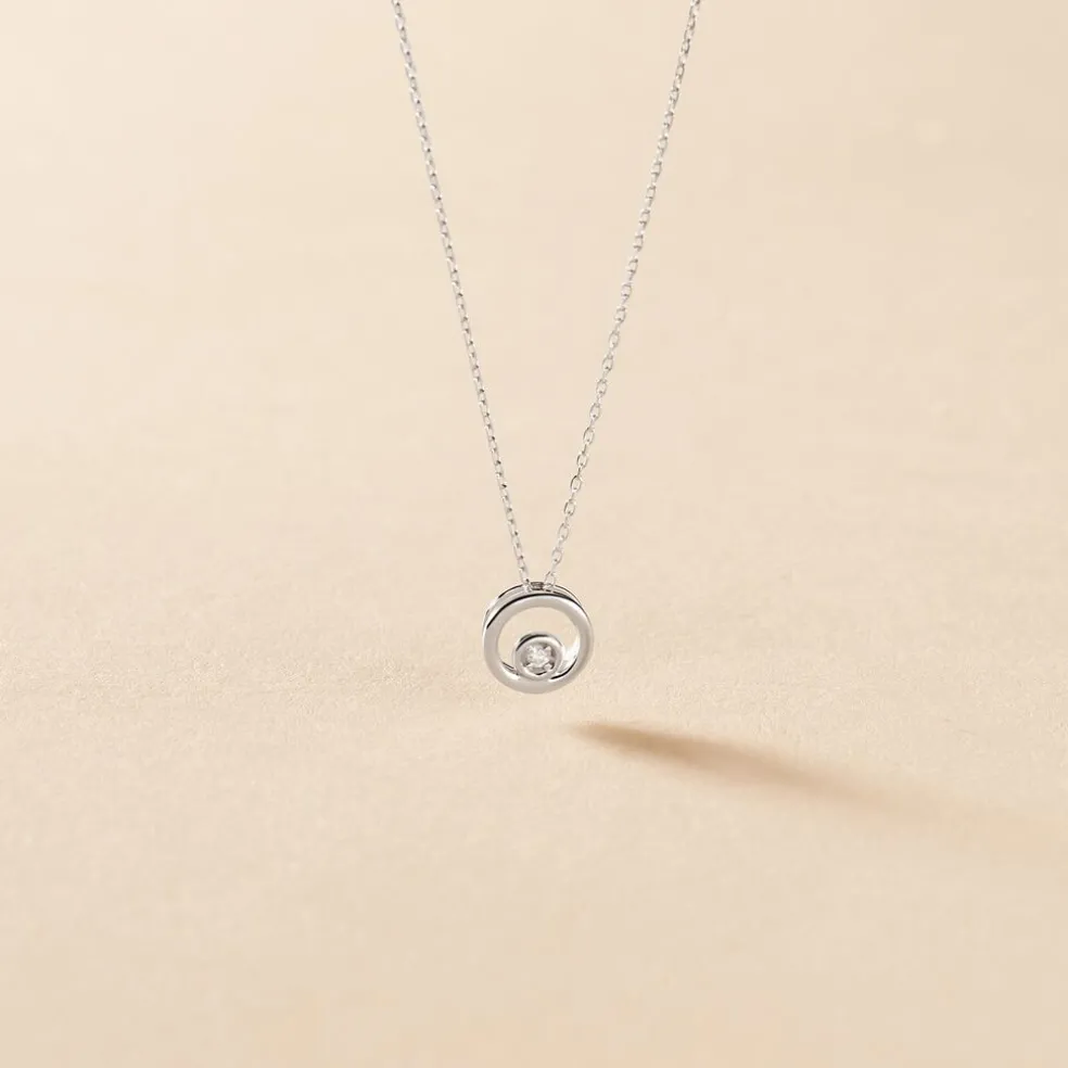 Collier Or Blanc 375/1000 Motif Cercle Ajoure Diamant Central 0.017ct 42cm
