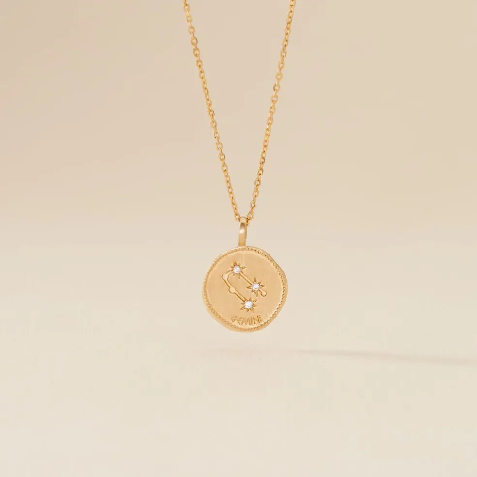 Collier Plaqué Or Jaune Pastille Mate Signe Astrologique Gemeaux Chaine Forcat 50cm