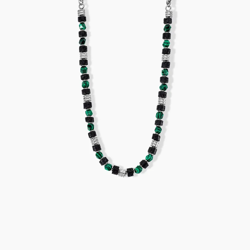 Collier Jourdan Bengale Acier Argente Malachite Verte Pierre De Lave Noire 55cm Jh250023n