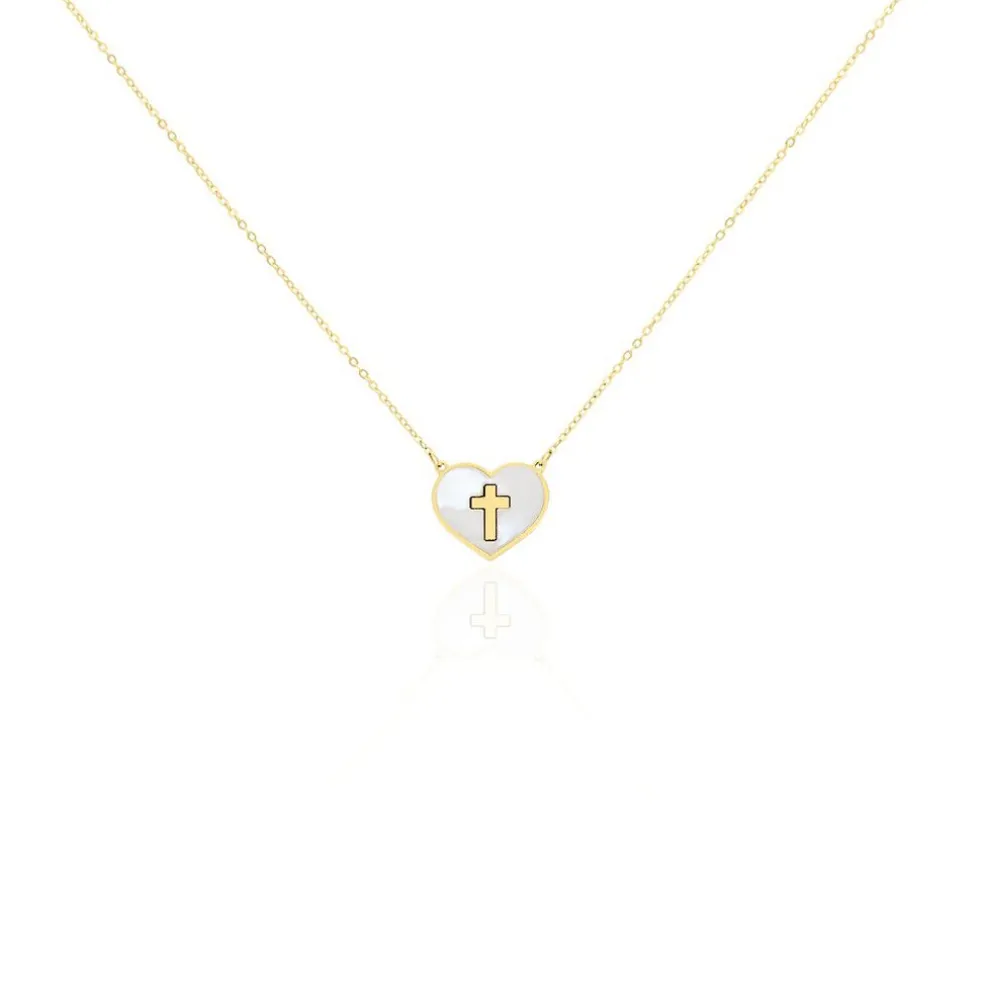 Collier Or Jaune 375/1000 C艙ur Nacre Blanche Avec Croix Maille Forcat 40+2cm