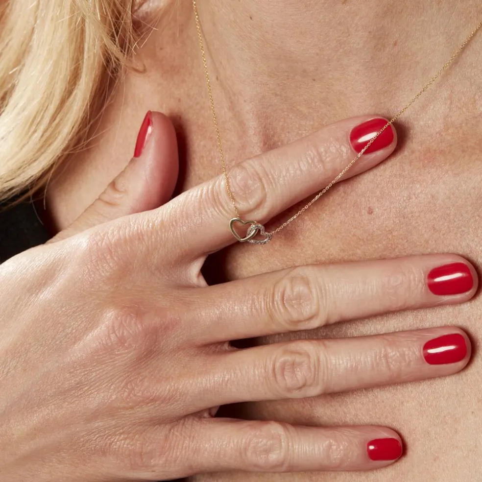 Collier Or Jaune 375/1000 Forme Double C艙ur Pavage Diamants Maille Forçat 42cm
