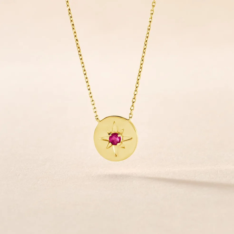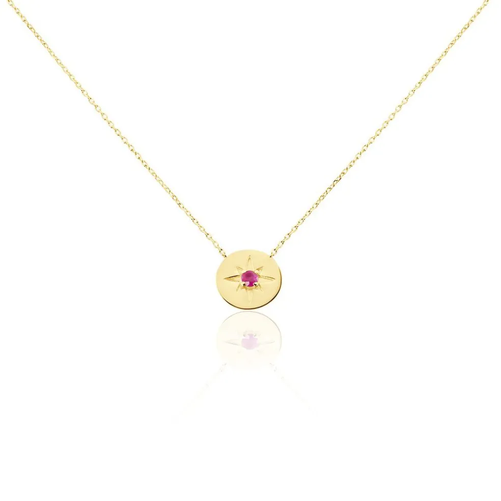 Collier Or Jaune 375/1000 Rubis 0.1cts Serti 4 Griffes Maille Forçat 42cm