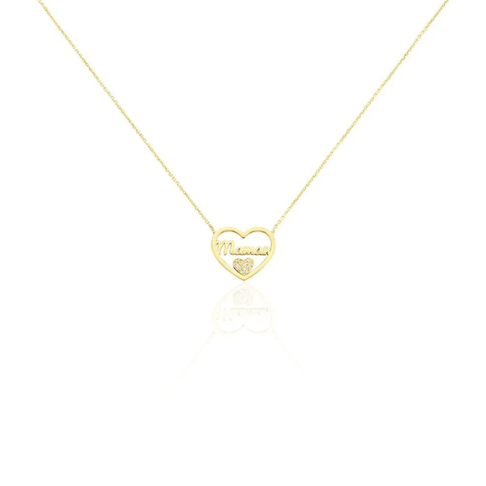 Collier Or Jaune 375/1000 Coeur Ajoure Message Maman + C艙ur Pavage Oxyde De Zirconium Maille Jaseron 40+2cm