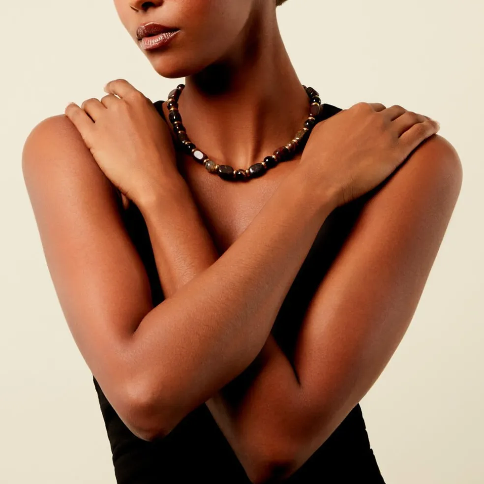 Collier Acier Inoxydable Jaune Pierres Rouges Et Agates Marron 44+3Cm