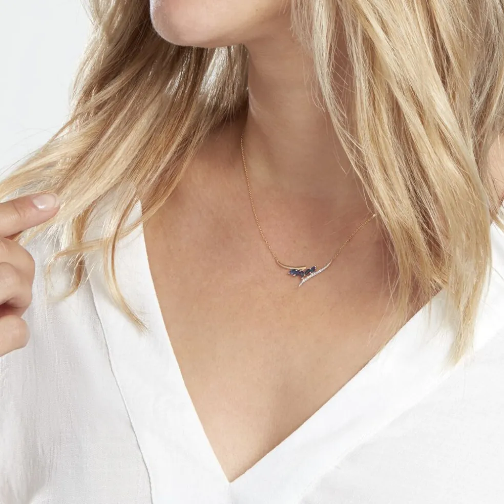 Collier Or Jaune 375/1000 Forme Vague Et Fleur Saphirs Tailles Navettes Et Diamants Maille Forçat 40+2cm