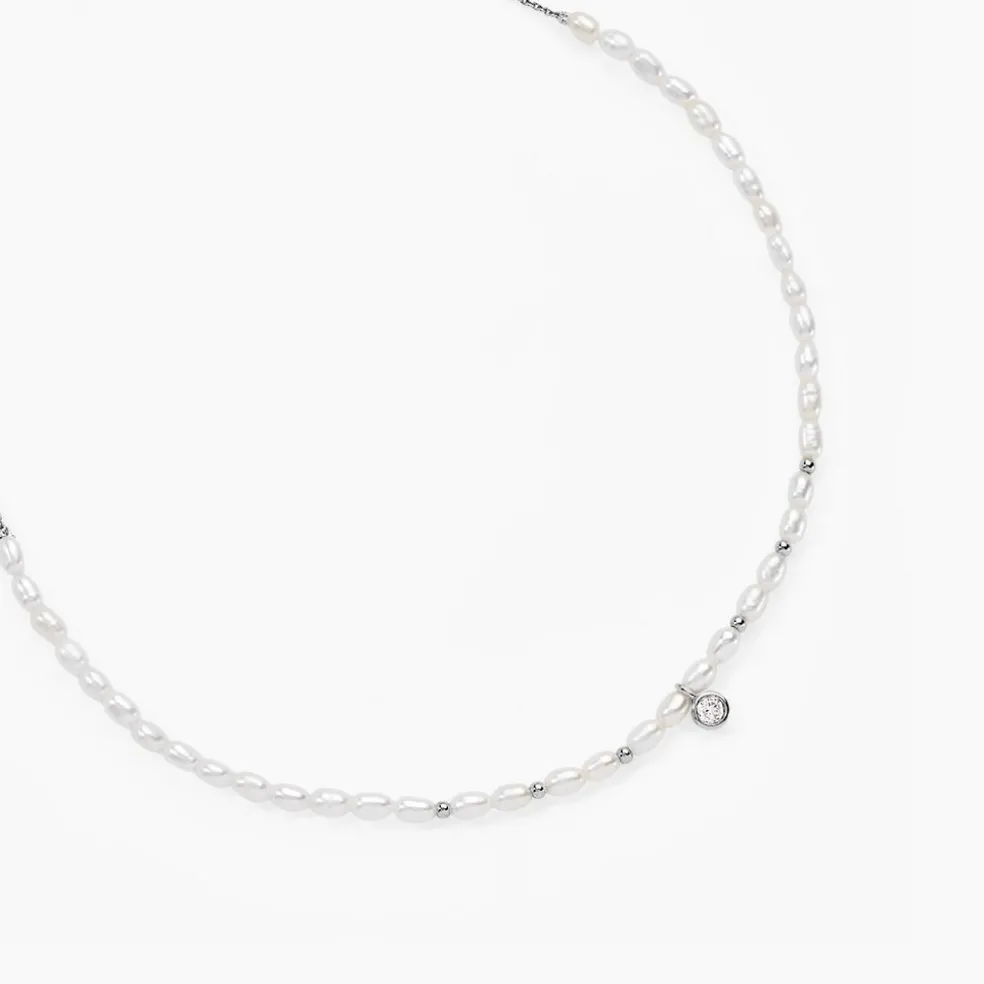 Collier Argent Blanc 925/1000 Oxyde De Zirconium Serti Clos Et Perles De Culture 42+3cm