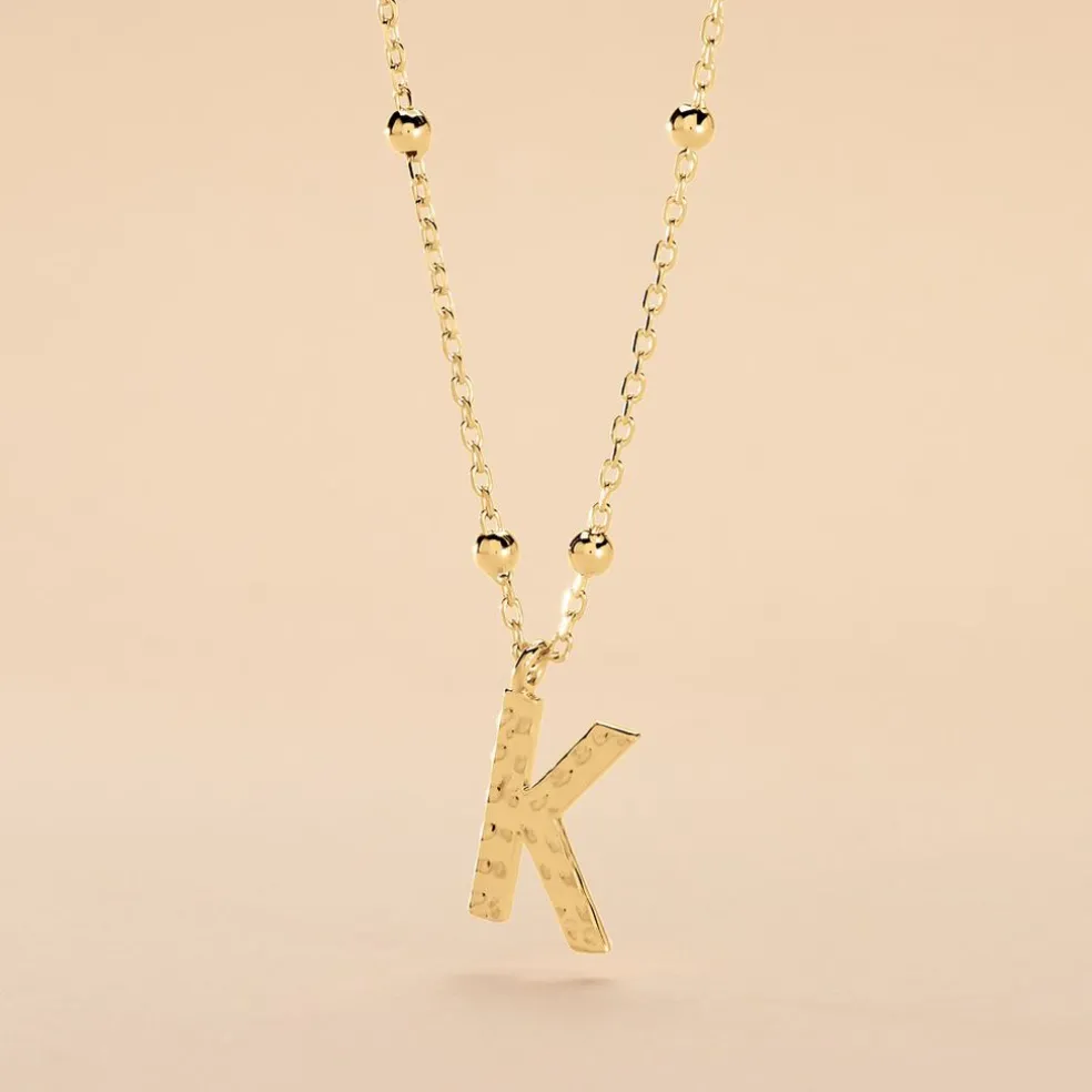 Collier Plaque Or Jaune Lettre K Martelee Et Petites Boules Chaine Maille Forcat Longueur 45cm