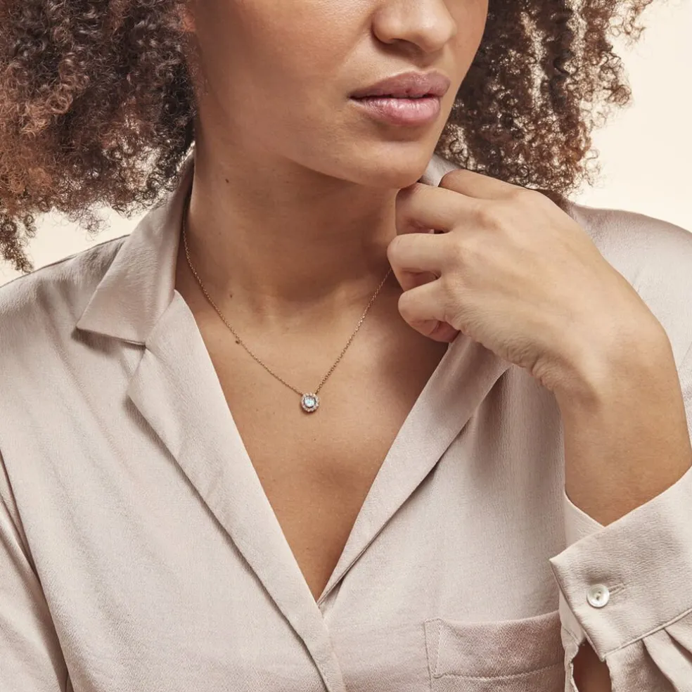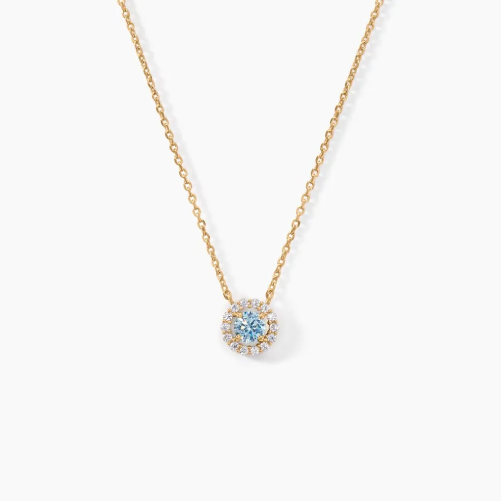 Collier Plaqué Or Jaune Entourage Pierre Artificielle Bleue Pavage Oxydes De Zirconium Blancs Maille Forcat 40+5cm