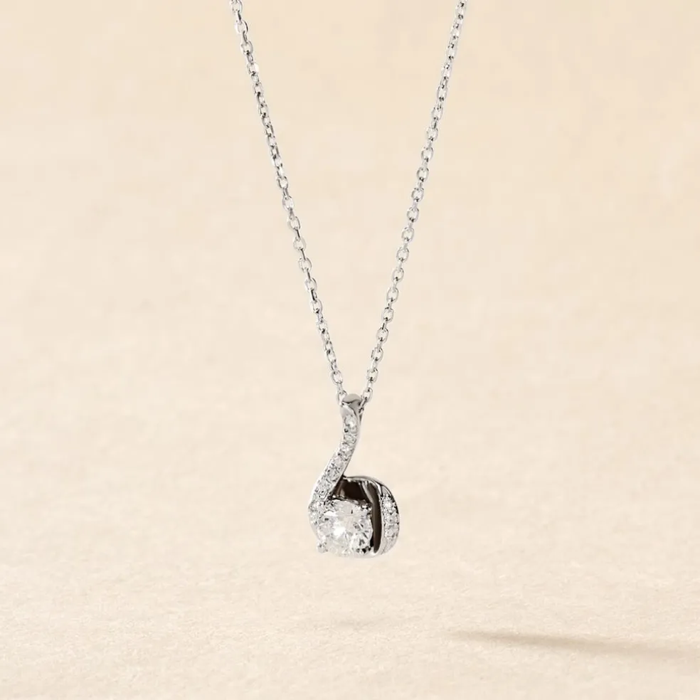 Collier Or Blanc 375/1000 Effet Vrille Solo Accompagne Diamants Gm 42cm