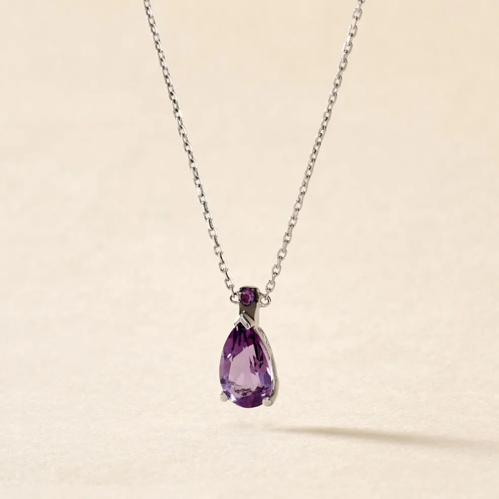Collier Or Blanc 375/1000 Maille Forçat Améthyste Poire Serti Griffes 40cm