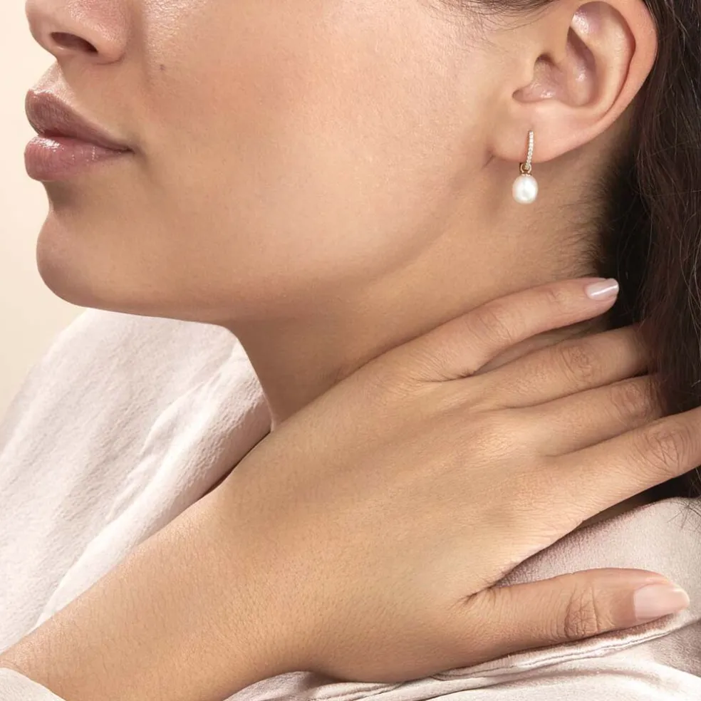 Créoles Or Jaune 375/1000 Perles De Culture 7/9mm Accompagné Oxydes De Zirconium