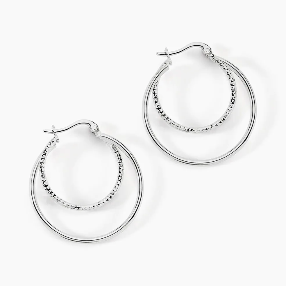 Créoles Argent Blanc 925/1000 Double Fil 1 Lisse 1 Diamante Largeur 1.5mm Diametre 20mm