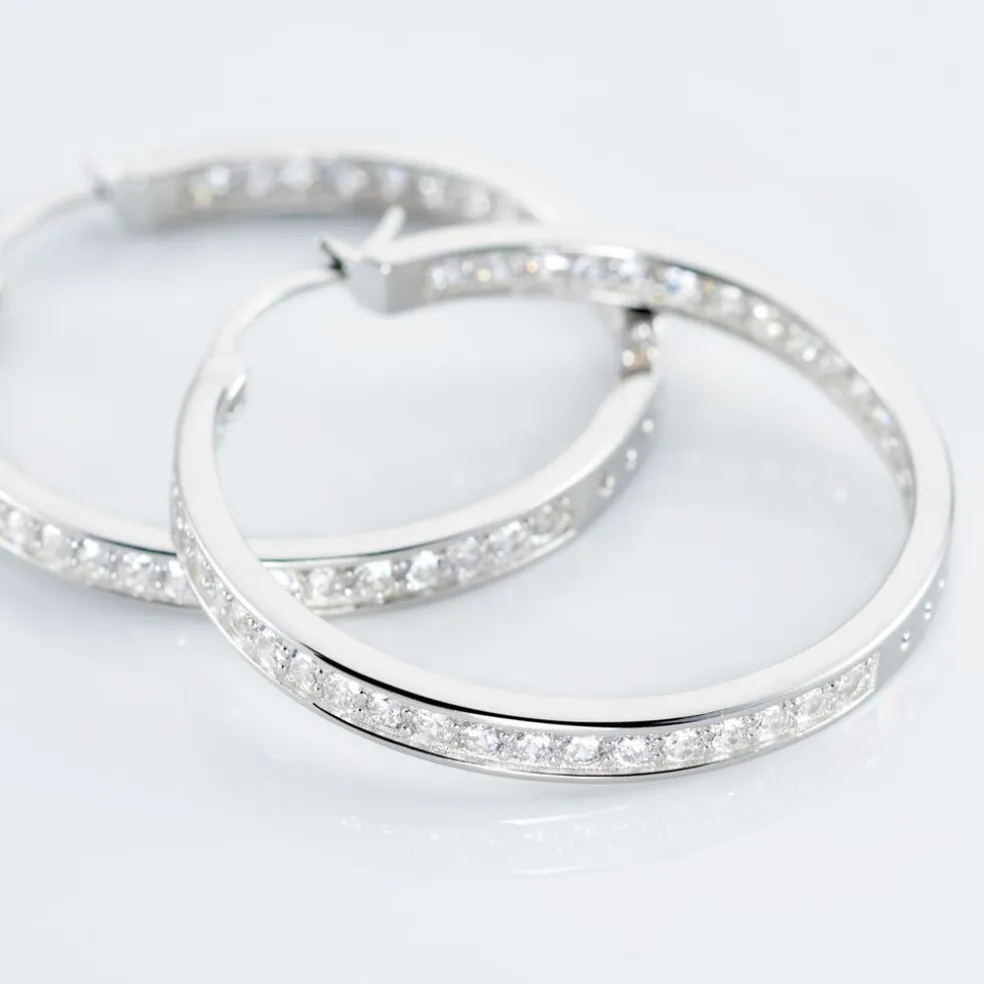 Créoles Classique Argent Blanc 925/1000 Oxydes De Zirconium Serti Griffes Diamètre 26mm