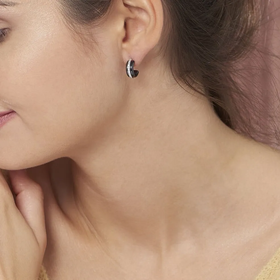 Demi Creoles Ceramik Design Argent Blanc 925/1000 Et Ceramique Noire Pavage Oxydes De Zirconium