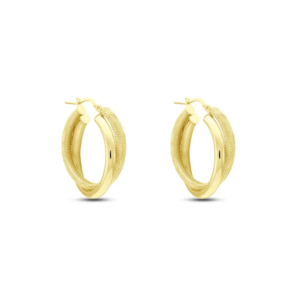 Créoles Or Jaune 375/1000 Croisées Fils Demi Jonc Et Rond Effet Martele Largeur 3mm Diamètre 20mm