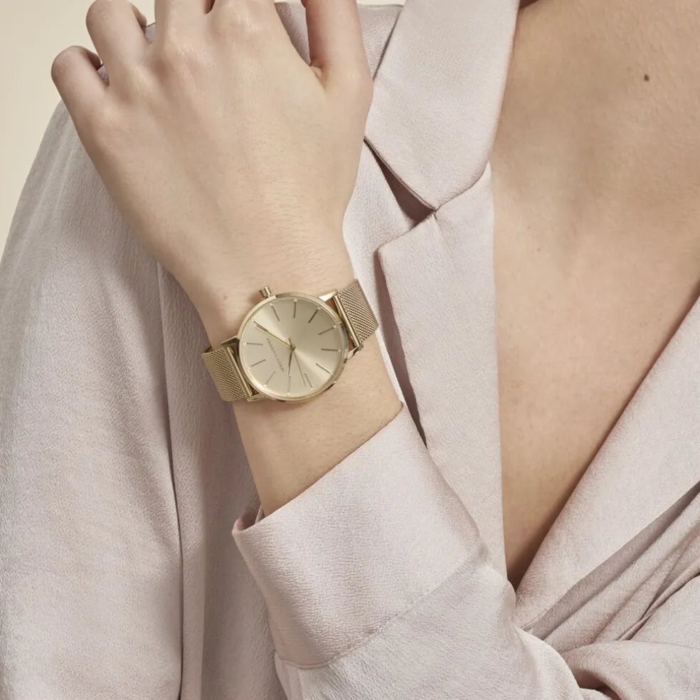 Montre Acier Dore Ronde 36mm Fond Dore Bracelet Acier Dore Poli