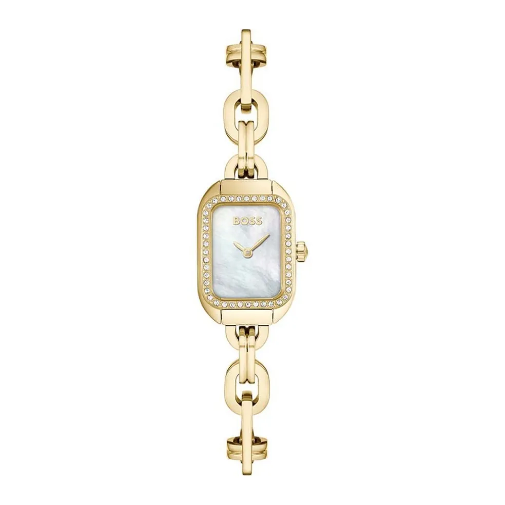Montre Boss Hailey Acier Dore Rectangulaire Quartz 19mmx28mm Fond Nacre Bracelet Acier Dore Fantaisie 1502740