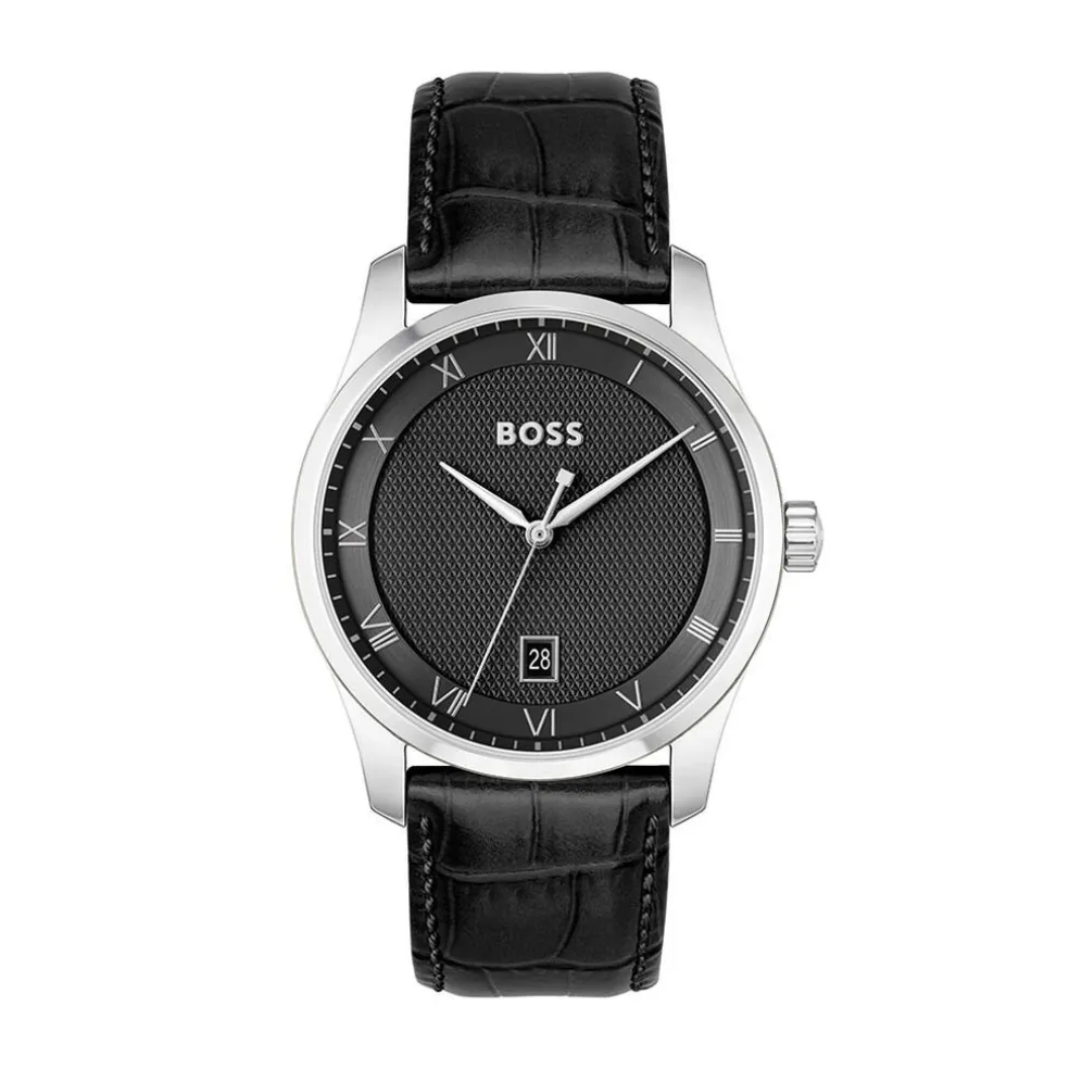 Montre Boss Principle Acier Argenté Rond Quartz 41mm Fond Noir Bracelet Cuir De Veau Noir 1514122