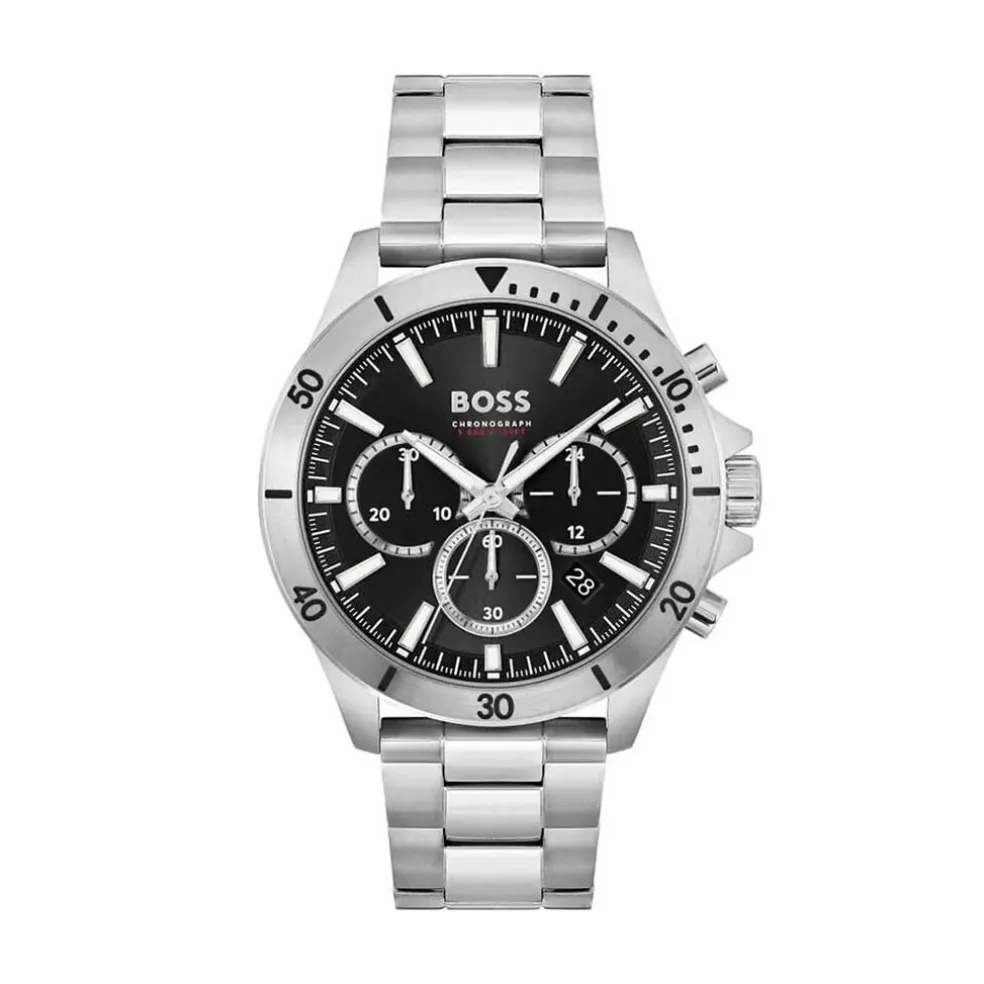 Montre Boss Troper Acier Argenté Ronde Quartz Chronographe 44mm Fond Noir Bracelet Acier Argenté 1514057