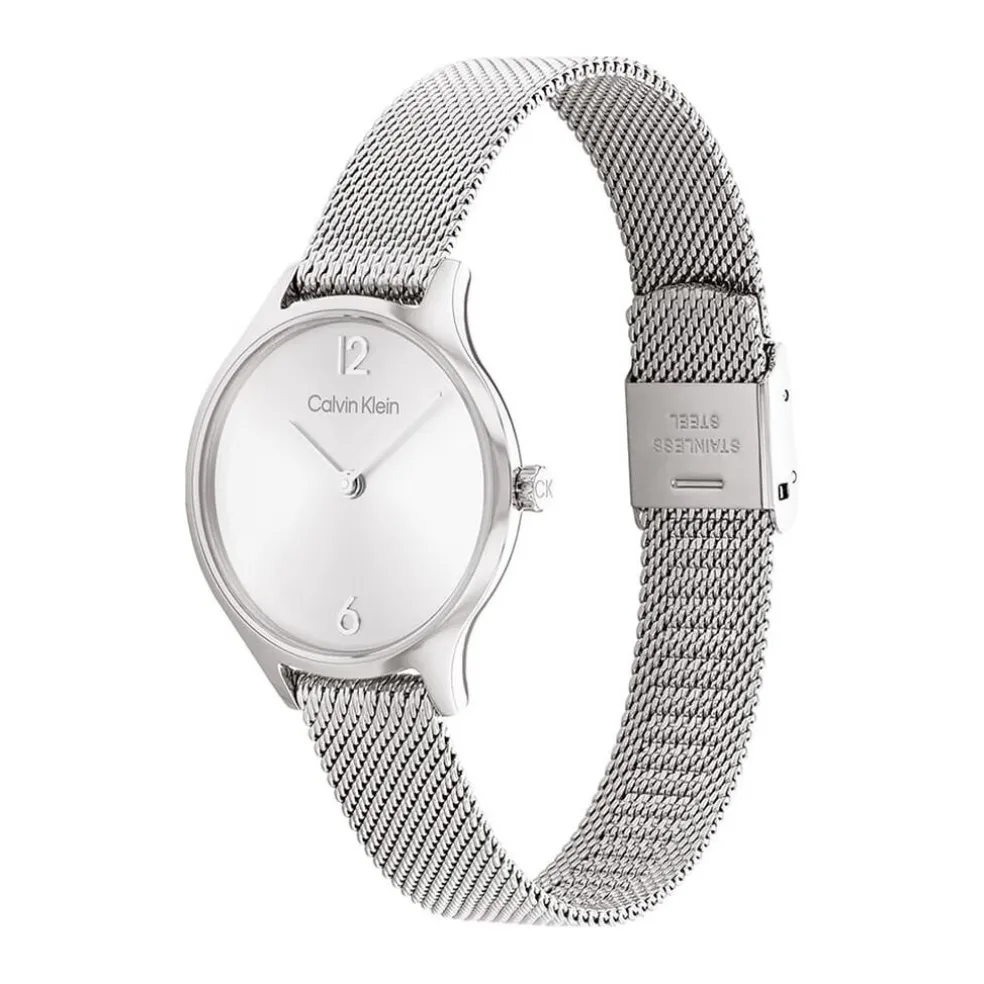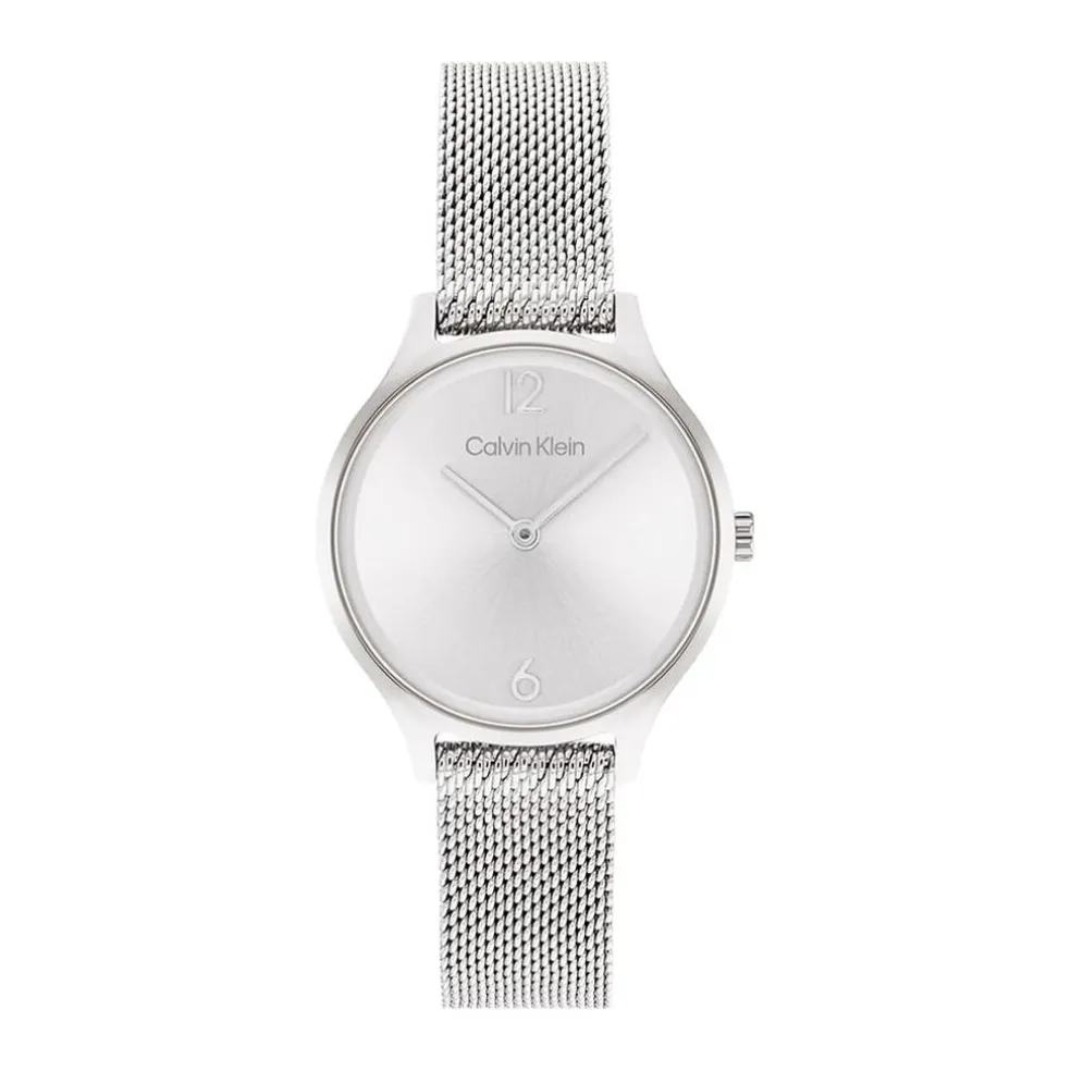 Montre Calvin Klein Timeless 2h Acier Blanc Ronde Quartz 28mm Fond Argent Bracelet Maille Milanaise Acier Argenté 25200058