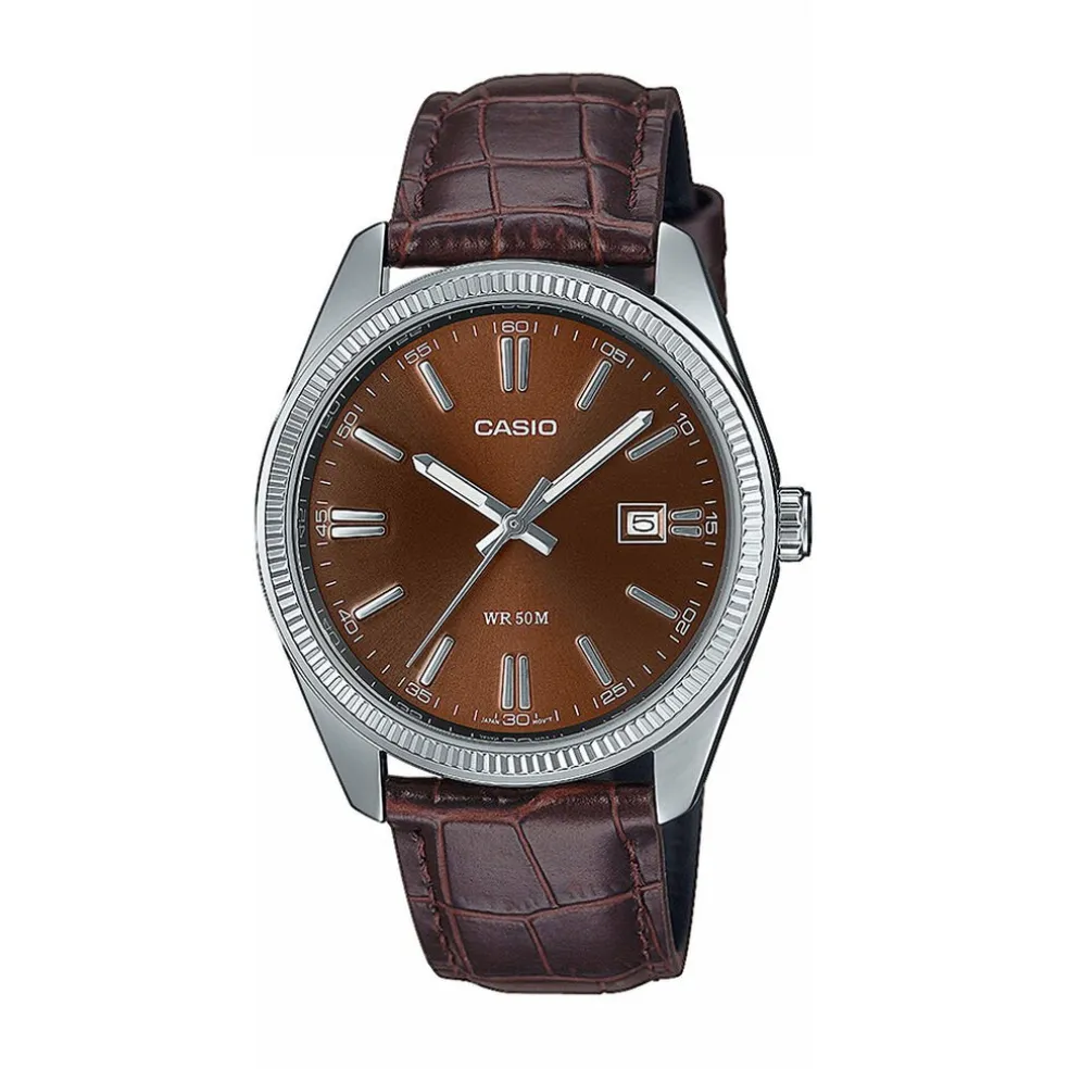 Montre Casio Laiton Argente Ronde Quartz 38.5mm Fond Marron Bracelet Cuir De Vache Marron Mtp-1302pl-5avef
