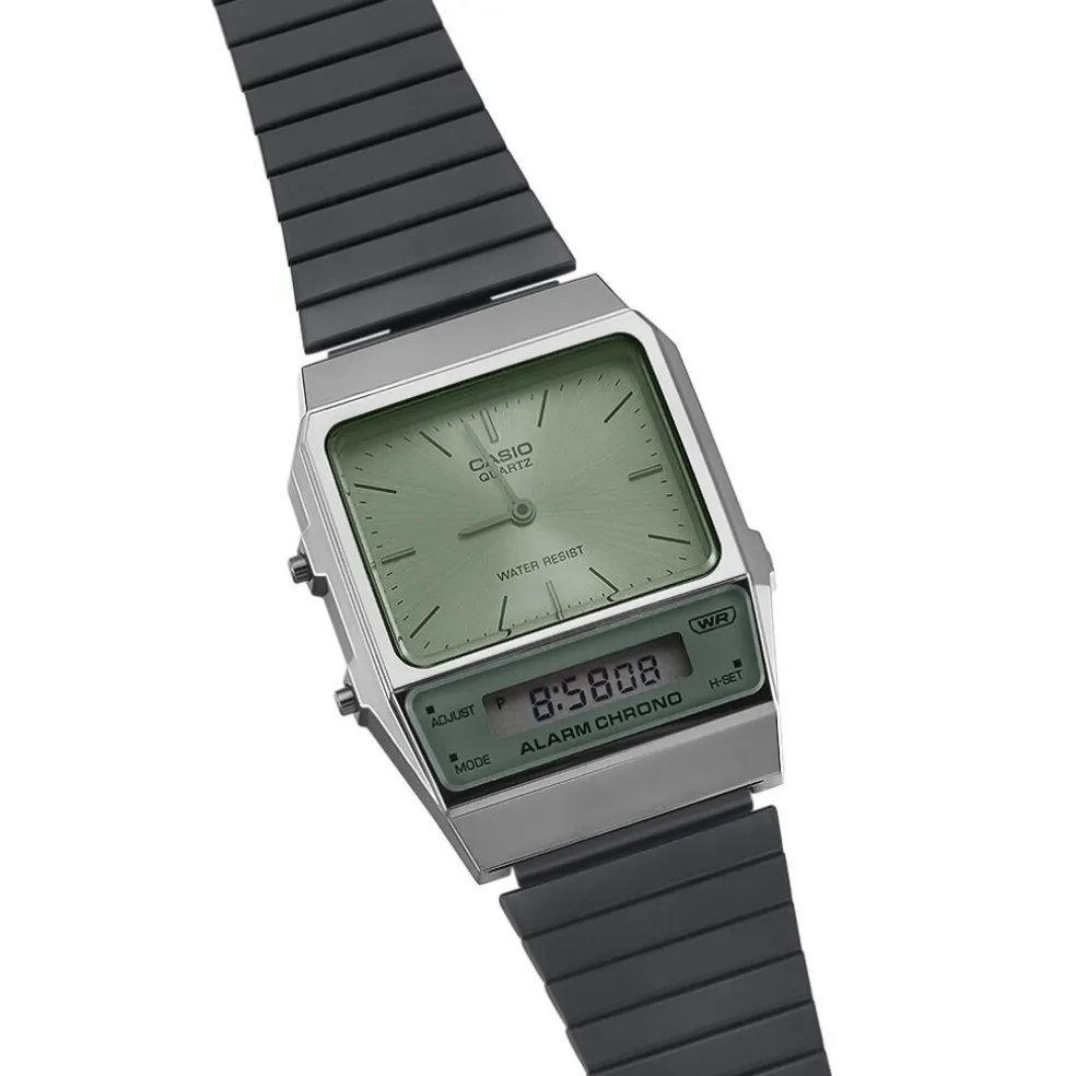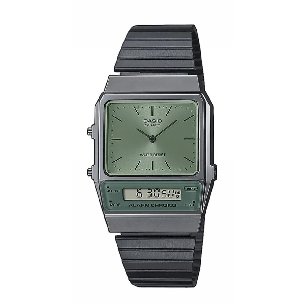 Montre Casio Vintage Edgy Résine Gris Rectangulaire Quartz 32.1mm Fond Vert Bracelet Acier Gris Aq-800ecgg-3aef