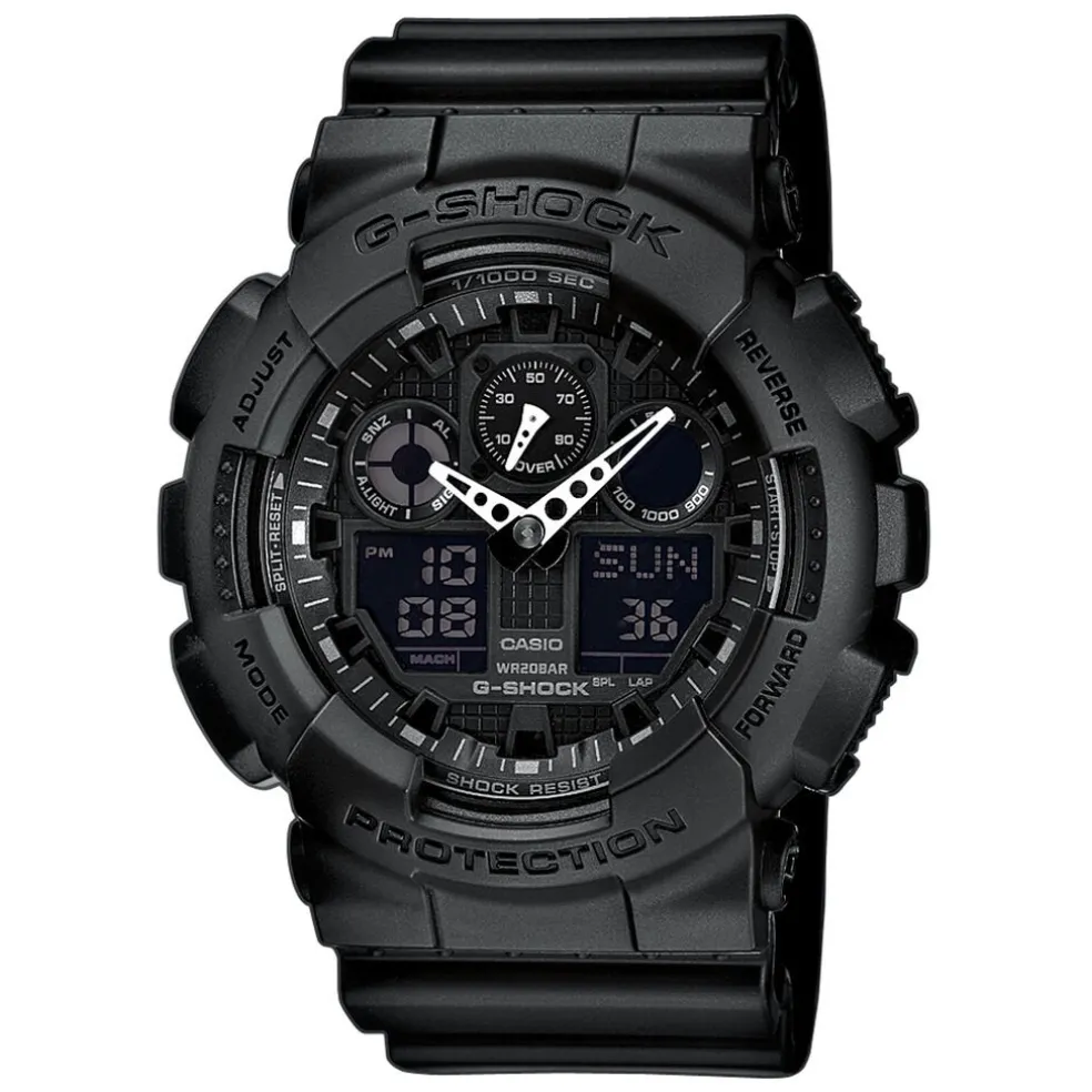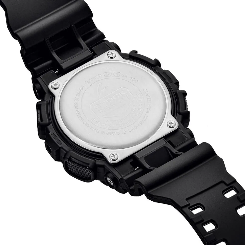 Montre Casio G-shock Black & White Acier Noir Ronde Quartz Chronographe 51mm Fond Noir Et Index Noir Bracelet Resine Noire Ga-100-1a1er