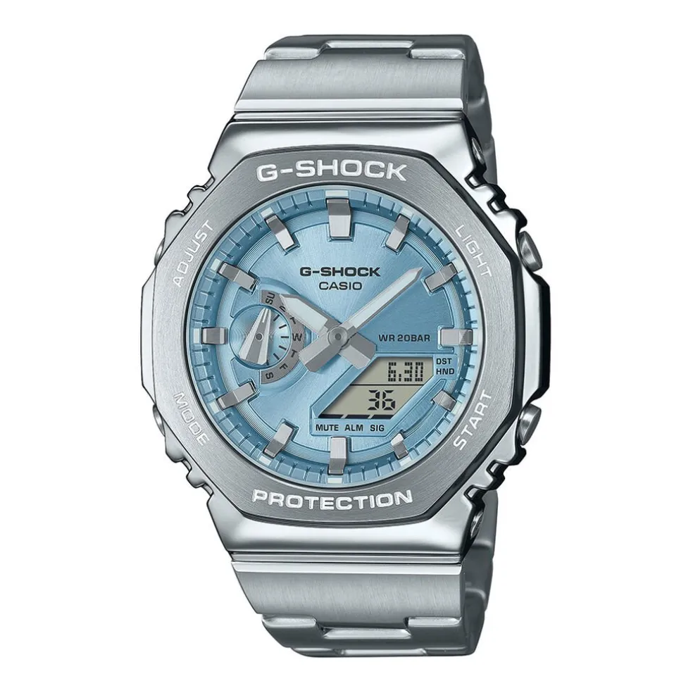 Montre Casio G-shock Anadigit Resine Argente Ronde Quartz Multifonctions 44.40mm Fond Bleu Sky Bracelet Acier Argente Gm-2110d-2aer