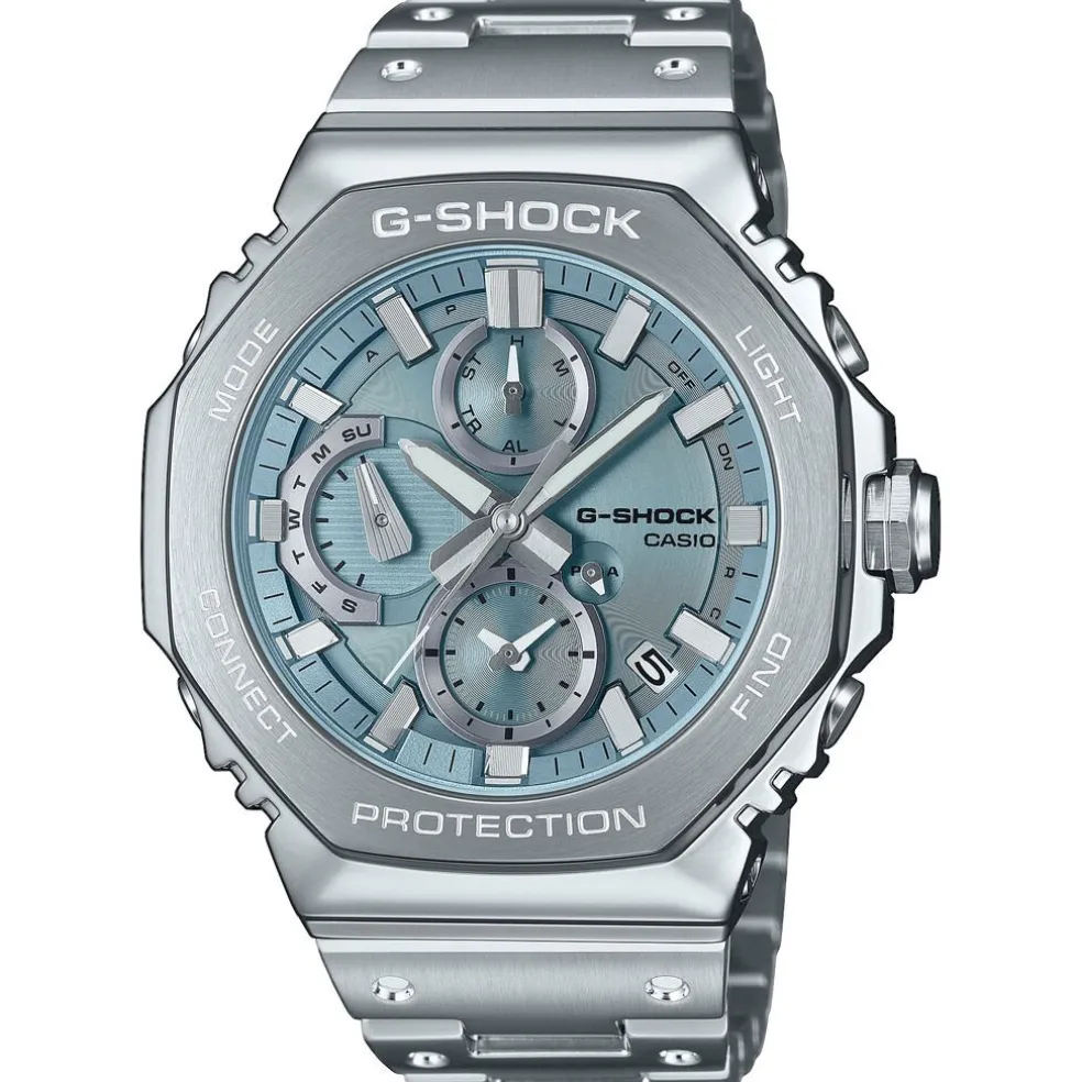 Montre Casio G-shock Premium Acier Argenté Ronde Quartz Solaire 46.3mm Multifonctions Fond Bleu Sky Bracelet Acier Argenté Gmc-b2100ad-2aer