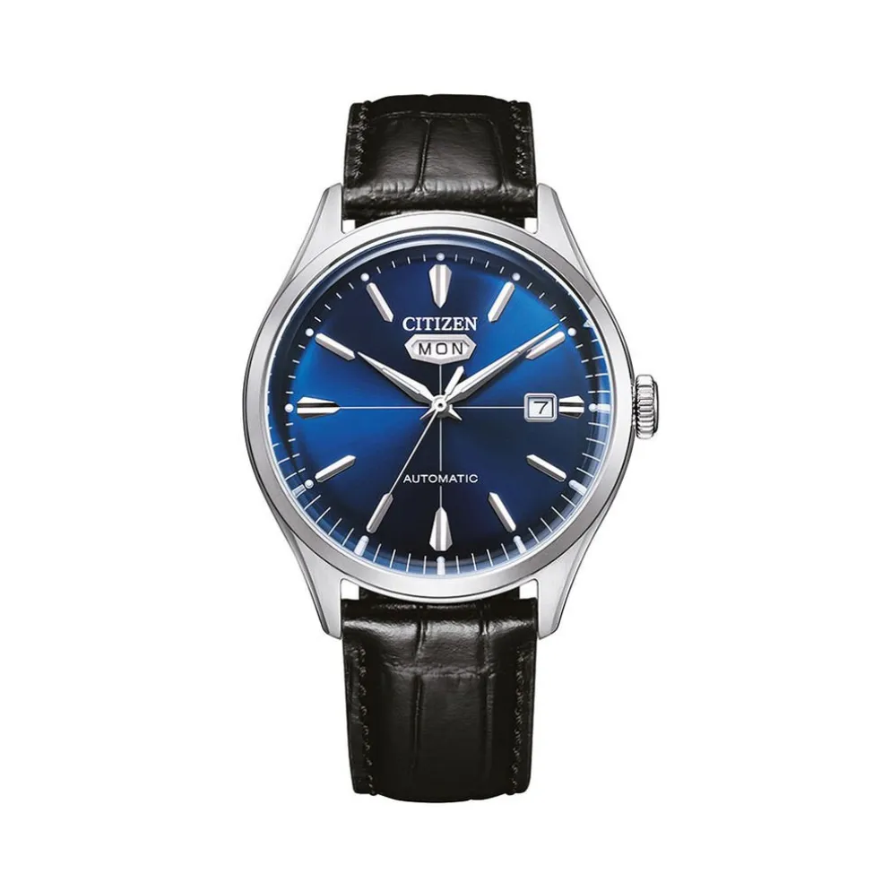 Montre Citizen C7 Mechanical Acier Argenté Ronde 40.2mm Automatique Fond Bleu Bracelet Cuir De Veau Noir Nh8390-20le