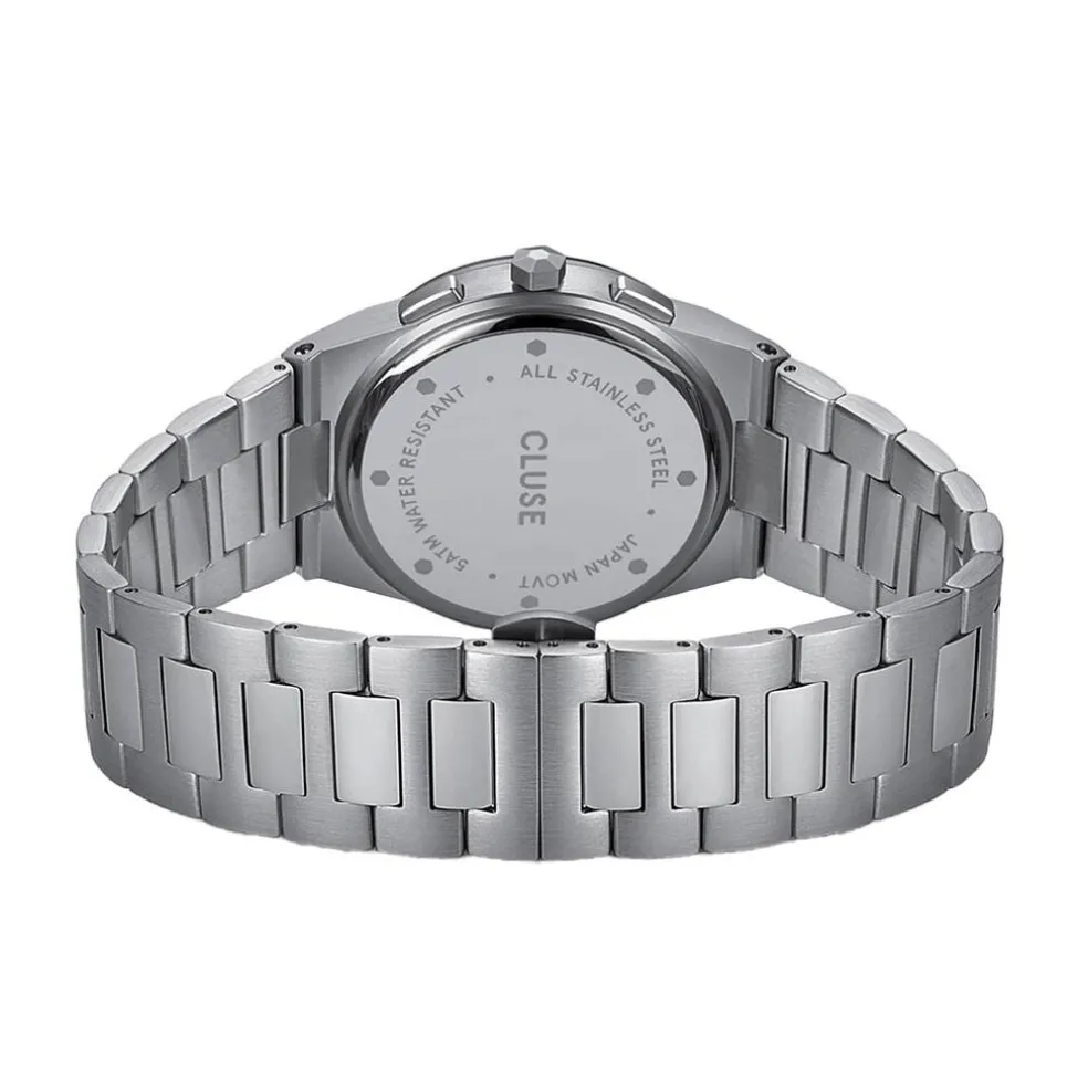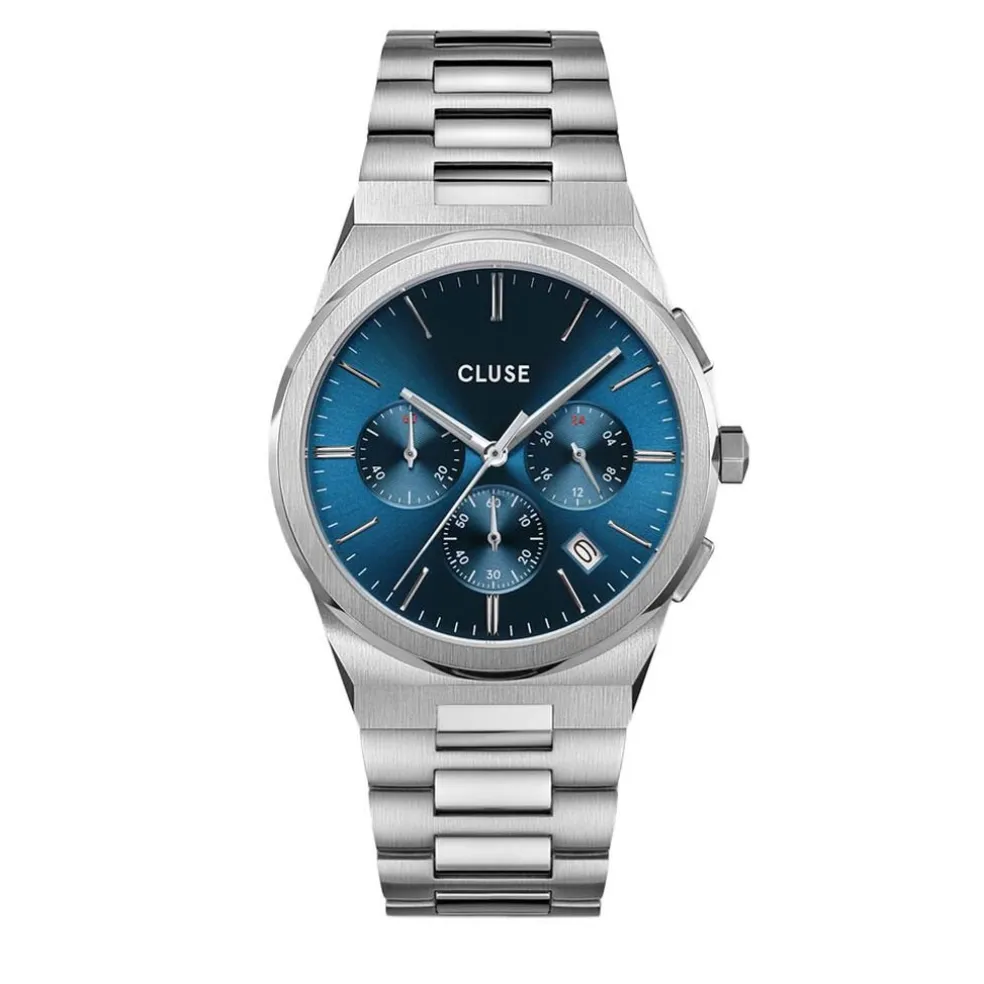 Montre Cluse Vigoureux Chrono Acier Argenté Ronde Quartz Chronographe 40mm Fond Bleu Lunette Argenté Bracelet Acier Argenté Cw20801