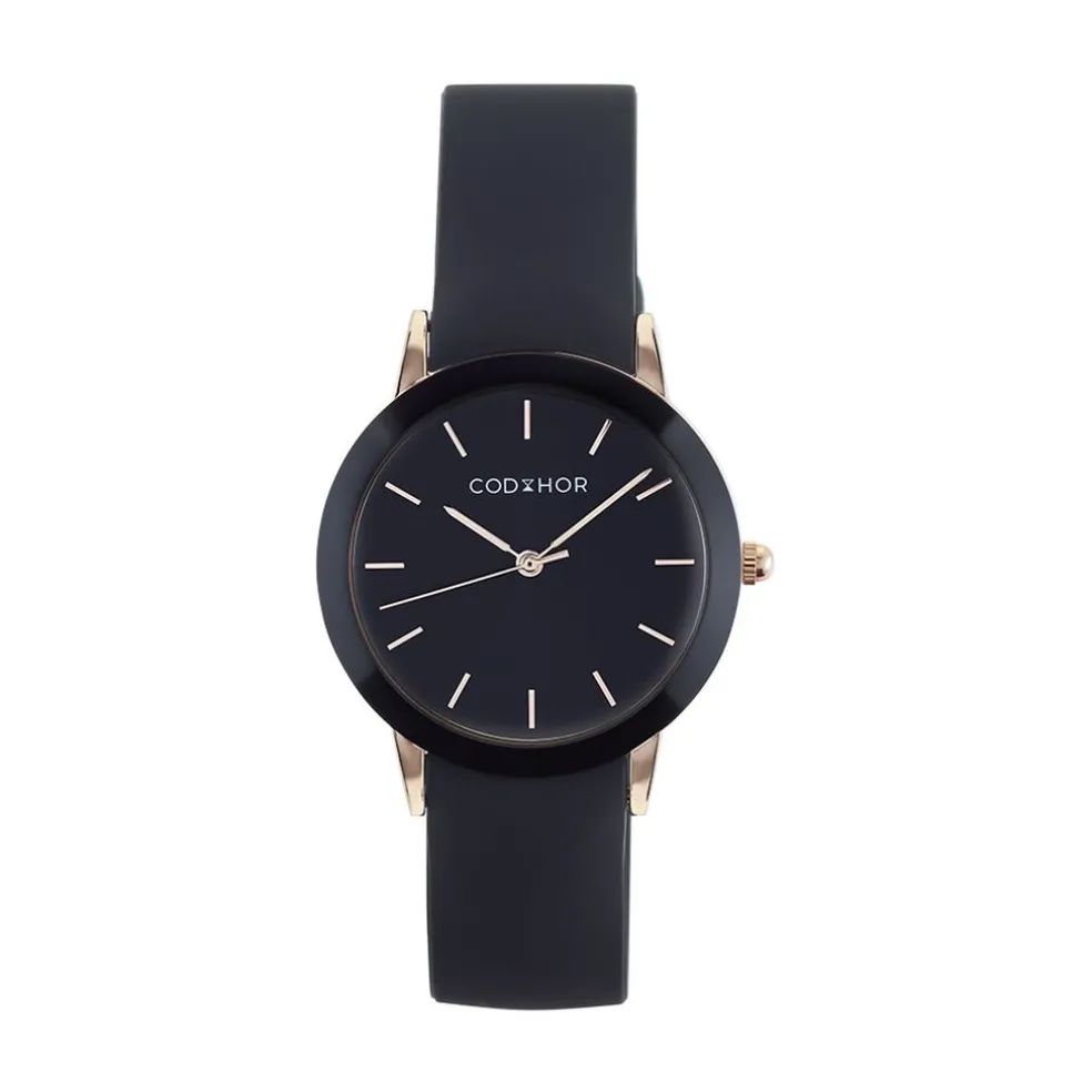 Montre Codhor Estelle Alliage Doré Rose Ronde Quartz 32mm Fond Noir Bracelet Silicone Noir Ch.0076l/01p