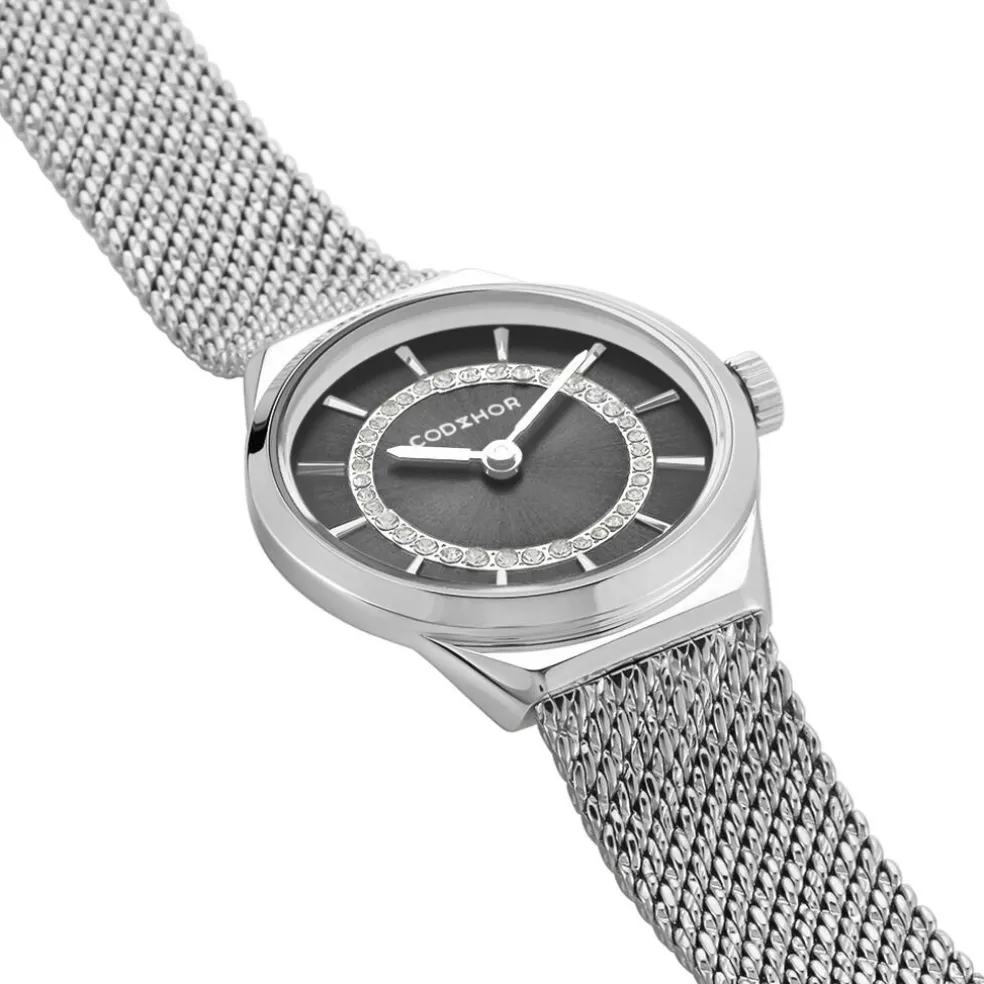 Montre Codhor Lola Alliage Argenté Ronde Quartz 27mm Fond Noir Et Strass Bracelet Milanais Acier Argenté Wba0310-001