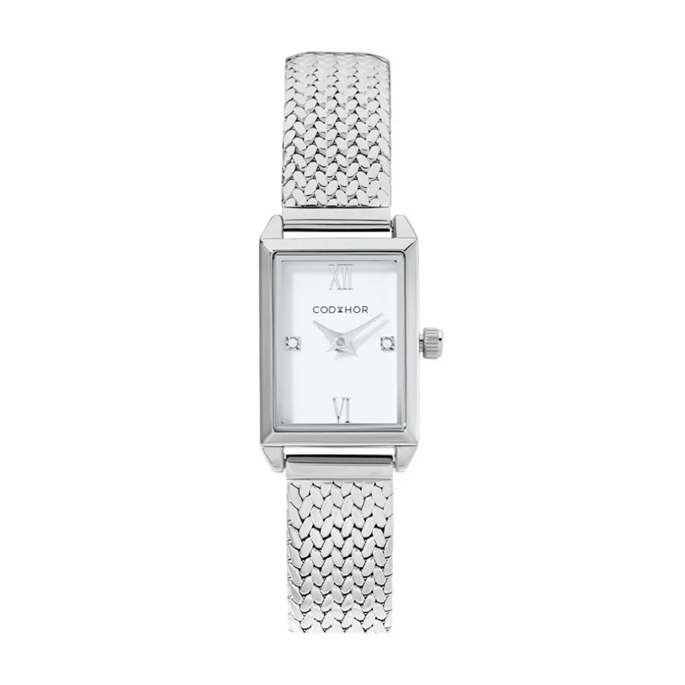 Montre Codhor Suzy Alliage Argenté Rectangulaire Quartz 17.5×28.5mm Fond Blanc Bracelet Milanais Acier Argenté P101073-a