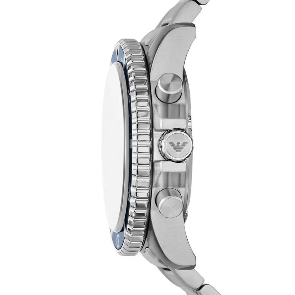 Montre Armani World Explorer Acier Argente Ronde Quartz Solaire Chrono 43.5mm Fond Bleu Lunette Bleu Bracelet Acier Argente Ar11681